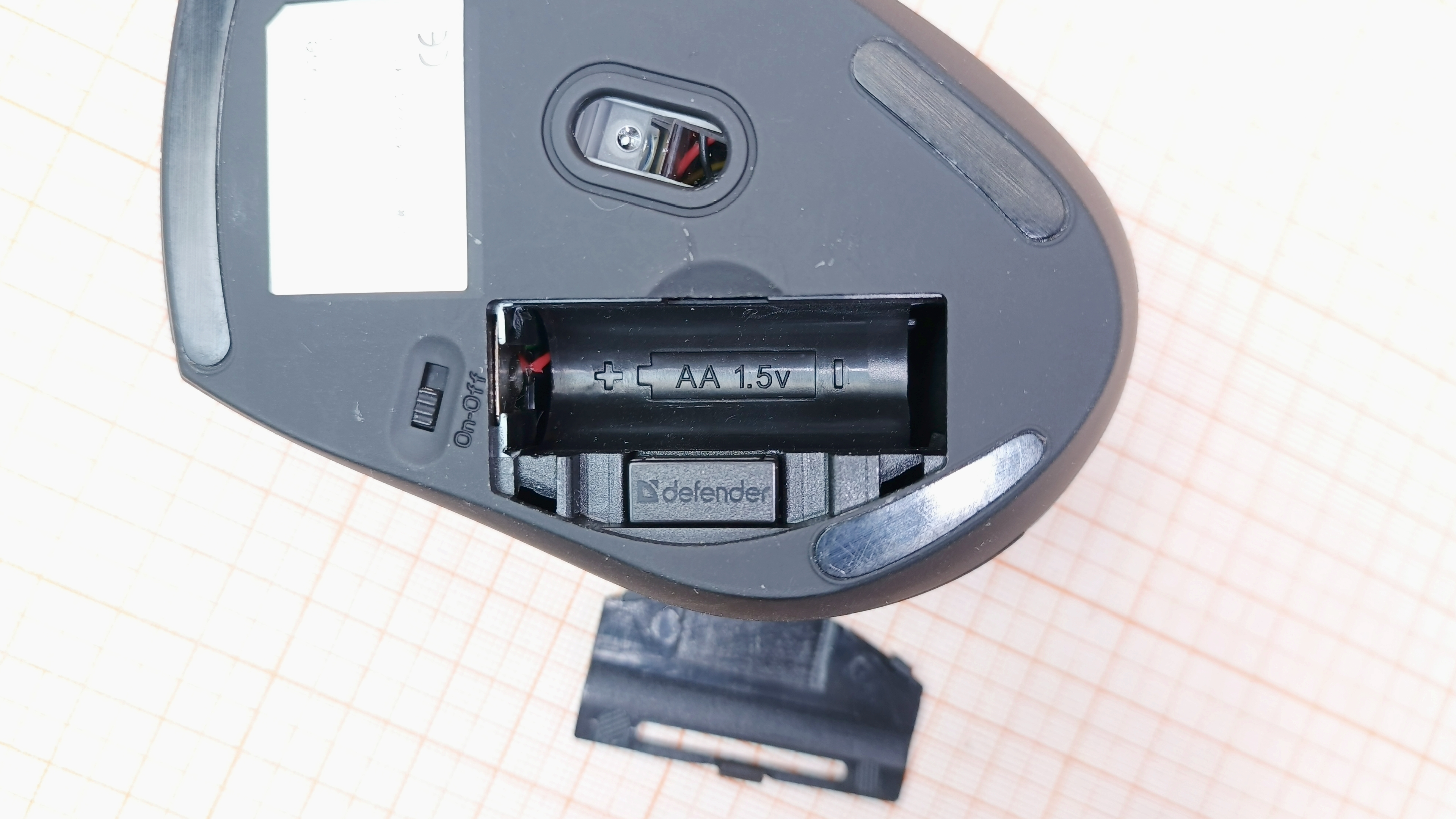 Работает на батарейках 1×AA, через USB-ресивер