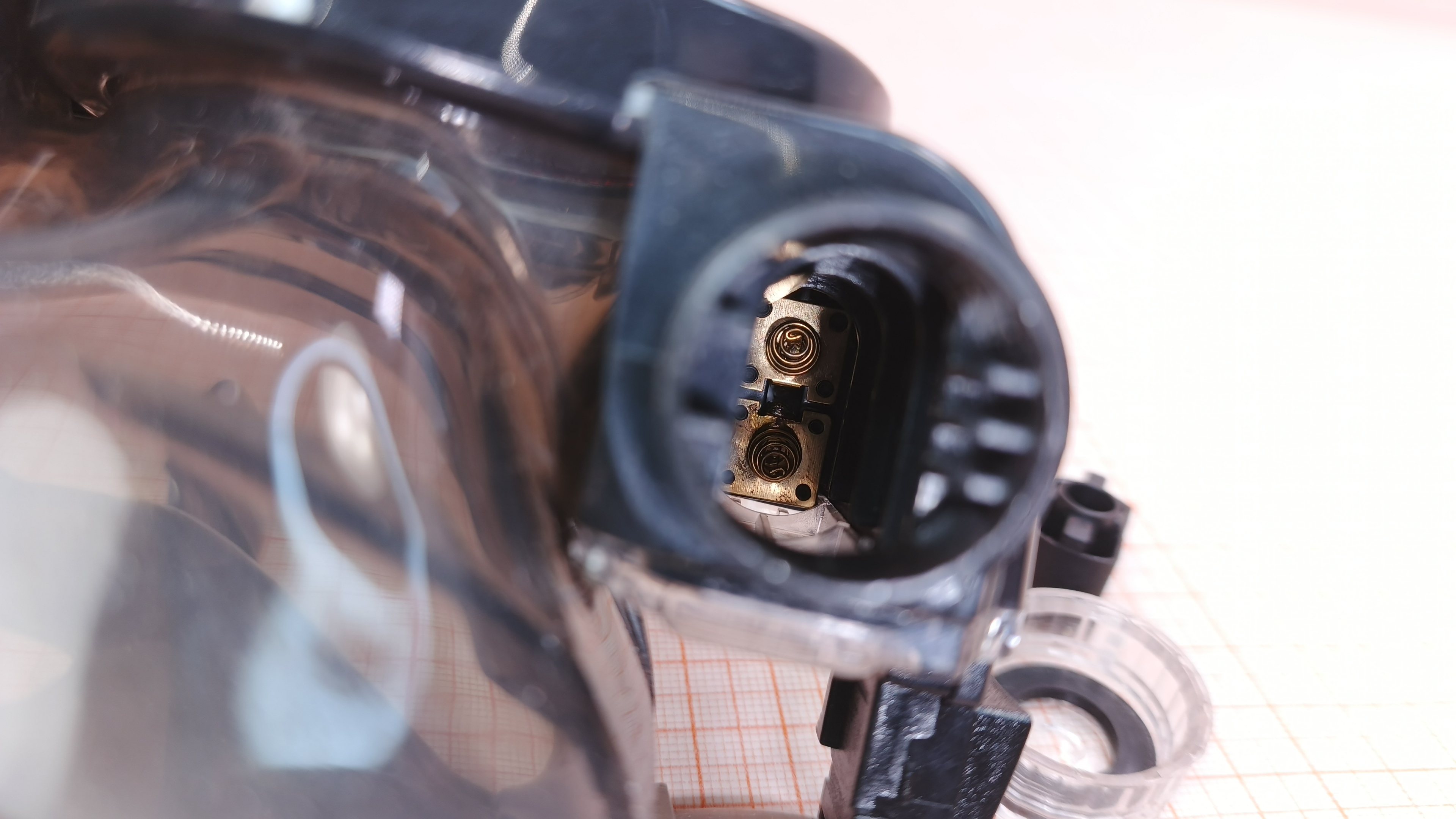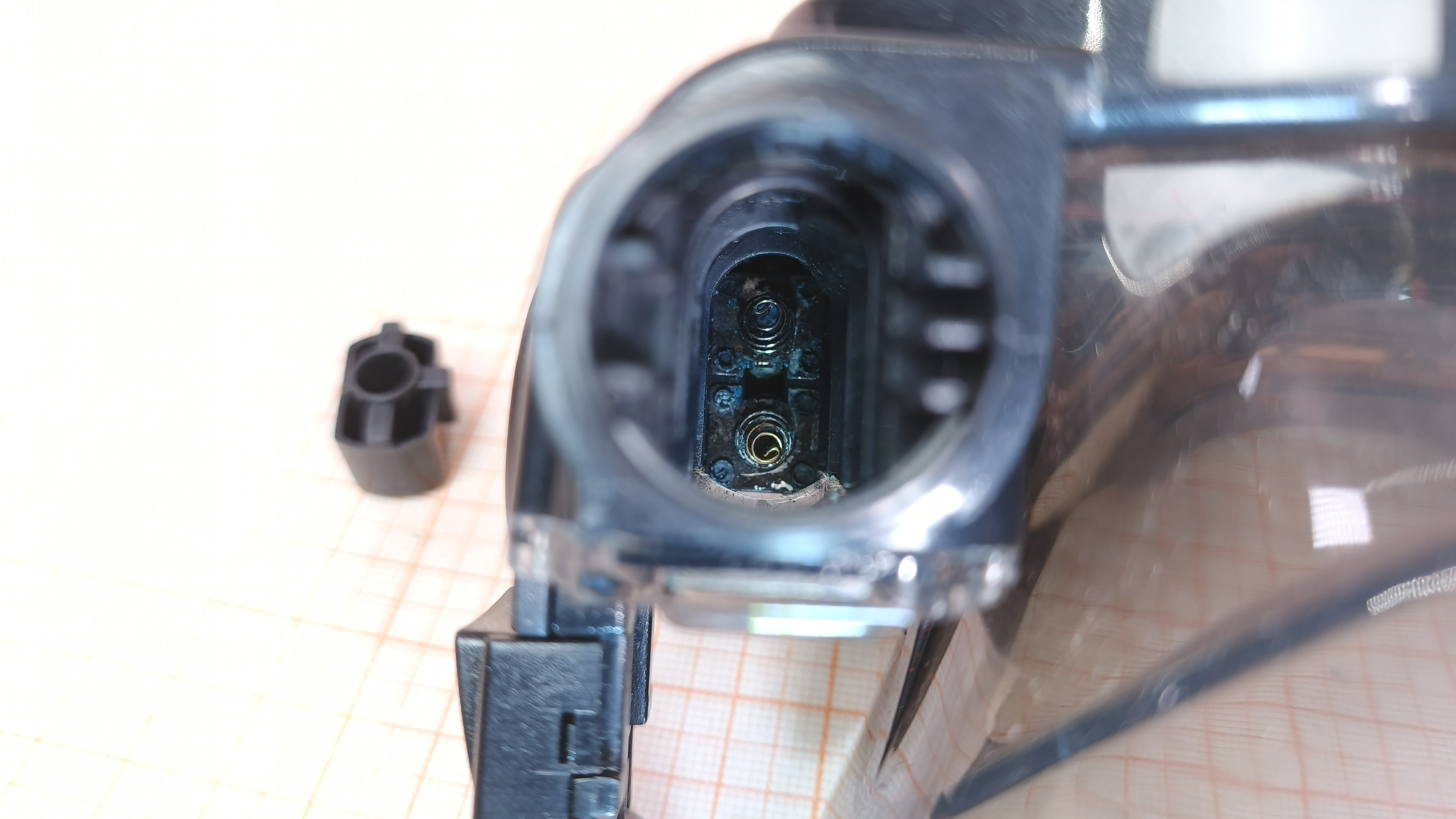 Включается, загорается индикация и дисплей. Обе клавиш работают исправно. Однако отсутствуют рычаги нажатия на клавиши. Тестовые фотографии и видео делает чётко, без шумов и помех. В правом батарейном отсеке присутствуют окислы контактов.
