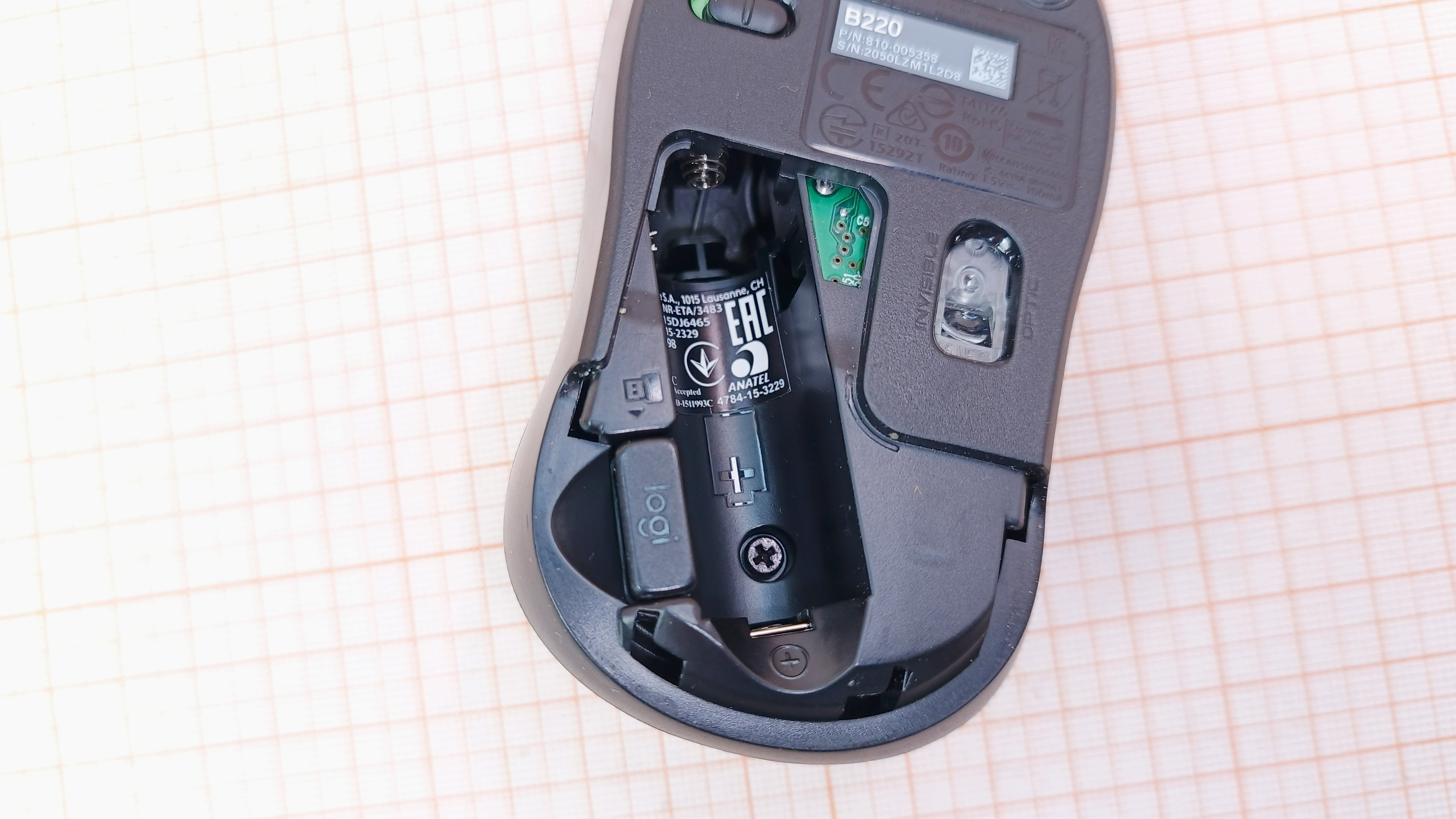 Работает на батарейках 1×AA, через USB-ресивер Logitech