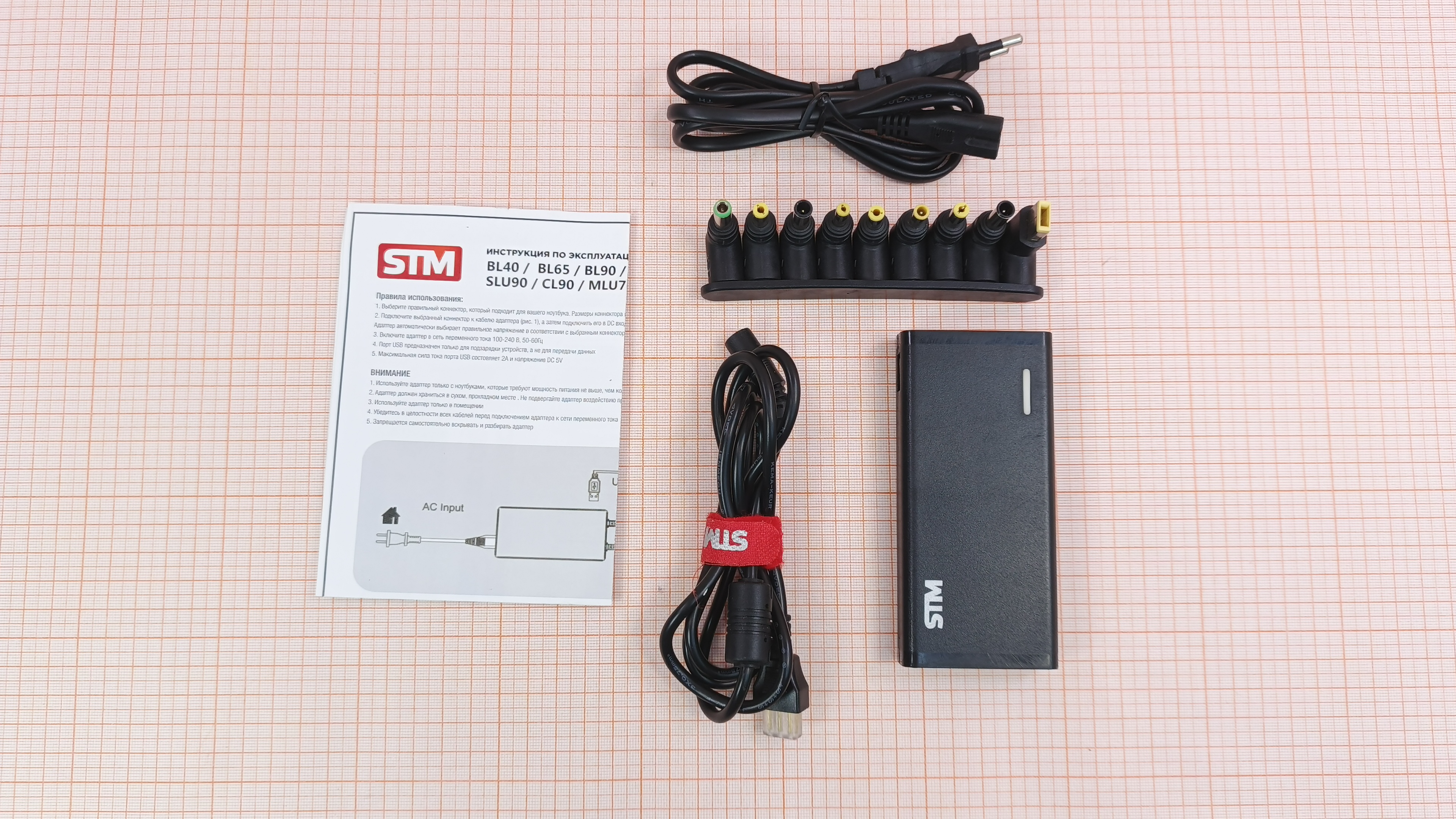 В комплект входят сменные штекеры для разных производителей ноутбуков.