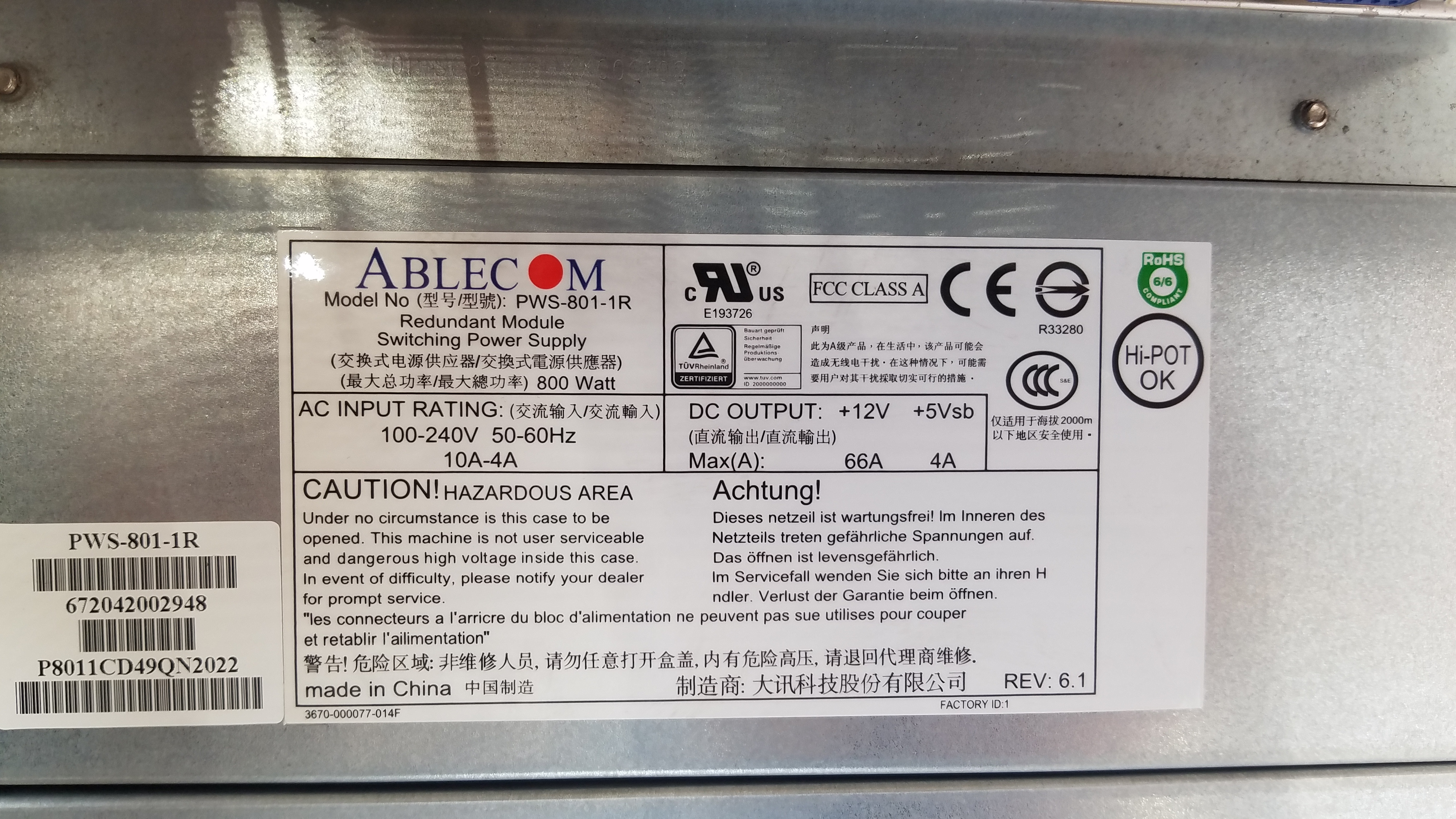 PSU Hot Swap Ablecom PWS-801-1R REV: 6.1 / 800W